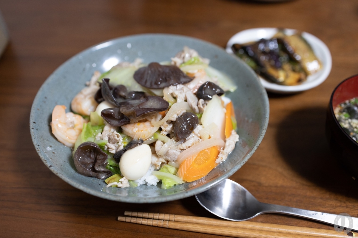枯れ木に生えていました。それなりにまとまった量が採れたので、八宝菜に入れて中華丼風に。市販のキクラゲよりもプリプリとして美味しかったです。